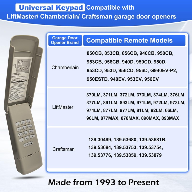 - 【Wide Compatibility】This wireless garage door opener keypad compatible with Liftmaster/chamberlain/craftsman garage door openers manufactured since 1993 has Yellow/Purple/Red/Orange/Green color Learn Button. DO NOT work for Craftsman 200.57933 57943 57953 Series 100 CR1150 139.57943 139.57953. The keypad does not support openers that use WI-FI connections.