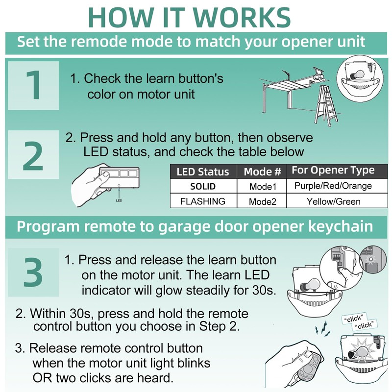 - Easy to Use: Refer to the garage door opener remote instruction to confirm the brand and model of the compatible garage door opener and select the corresponding learning button for programming. The garage door opener can be conveniently placed on the can visor using the visor clip