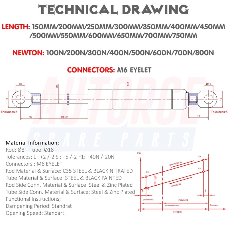 Universal Gas Struts Springs Heavy Duty Shock Absorber With EYELET Heads Force From 100N to 2000N, Open Length From 150MM to 1000MM AUTORCE Lift Support System (200 (N), 350MM)