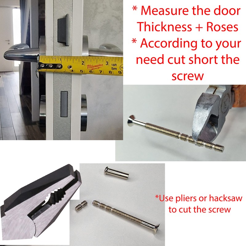 - [ HOW TO USE SCREWS FOR HANDLES ] : Drill a hole through the door leaf, place door handle on the door to match up with the hole drilled and push the screw through the door handle, door leaf the handle on the other side. Attach the sleeve and tighten up. Follow these instructions for all 4 holes in the door handle. The result is a handle securely fixed with screws that cannot be pulled through.