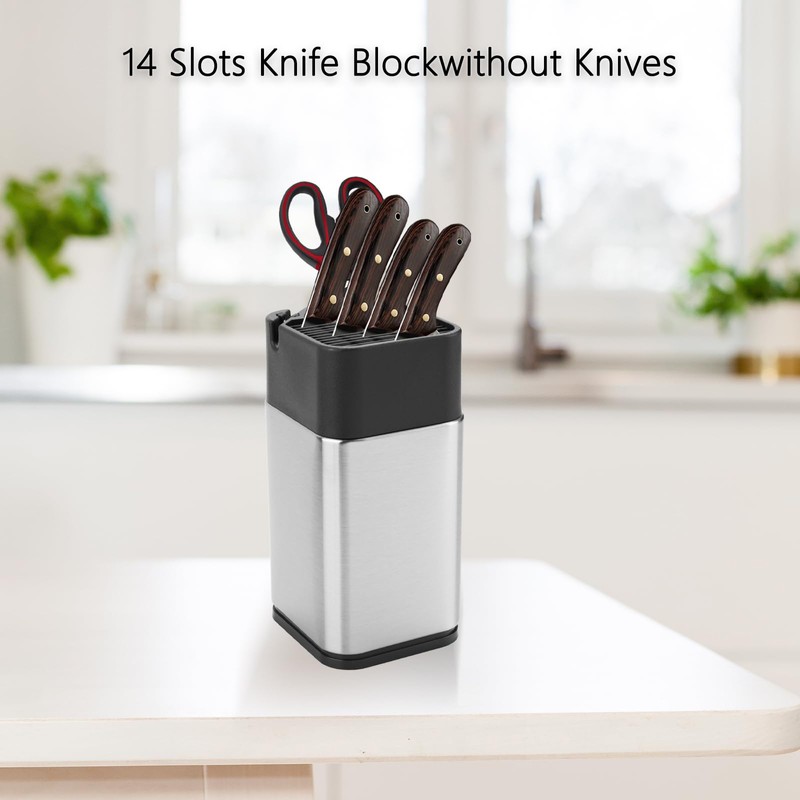 - Universal Storage: 14 slots and 1 scissor slot, suitable for storing carving knives, paring knives, chef knives, bread knives, steak knives, utility knives, etc.