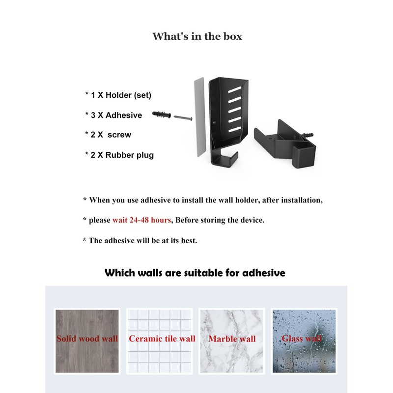 • Two Kinds of Installation Methods: Screw and adhesive, the cable box wall mount that you can choose which way to install according to your requirements, adhesive is suitable for use on smooth and flat walls, the weight of the device is less than 1 kg. Damage-free, For example, marble walls/wood walls/glass walls/tile walls, etc. If your wall is not smooth and flat and the weight of the devices exceeds 1 kg, it is recommended that you choose screw installation.