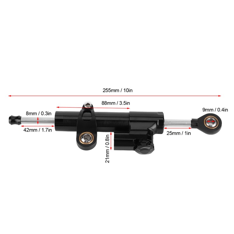 1、Universal motorcycle steering stabilizer, fits for Yamaha, for Ducati, for Honda, for Suzuki, for Aprilia, for Kawasaki, etc. 2、The adjuster can be precisely clicked between settings to operate smoothly and correctly. 3、Used to reduce the impact directly from uneven roads and the vibration of the steering system to improve the steering performance. 4、The complete damping system uses speed sensitive technology to help maintain safety control and reduce fatigue. 5、High‑quality surface processing, made of T6061‑T6 aluminum, oxidation resistance and durability. 6、It is strongly recommended to install on bicycles over 600CC, not including mounting kit.