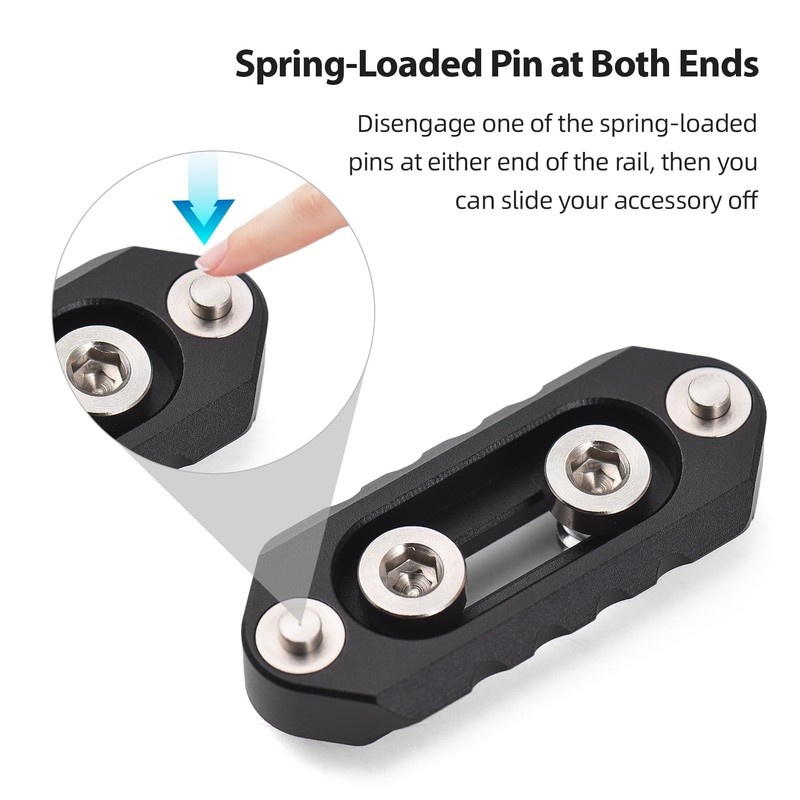 - 【Quick Release】Releases one of the spring loaded safety pins on either end of rail and you can quick slide your accessories off.