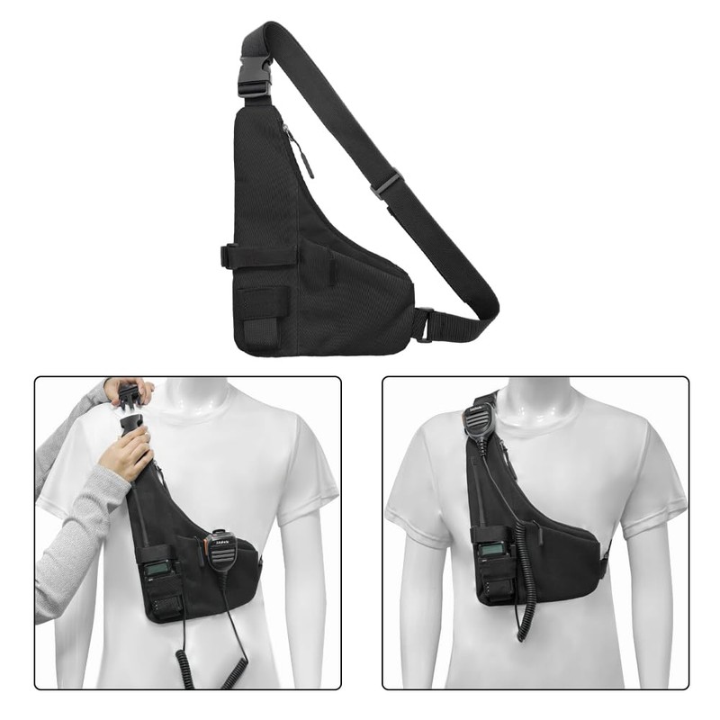 The new L-shaped chest bag for walkie talkies has a large storage space. It can hold your radio, water bottle, and a portable zippered pocket for your phone, making travel more convenient. There is also a large zippered pocket at the back with a large capacity, which can carry your phone, laptop, map, sunglasses, pen, and more. Zipper invisible design to prevent missing items from being carried around.