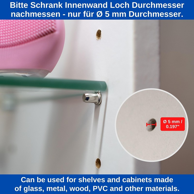 - Diameter 5 mm shelf holder for use for all types of furniture: the shelves glass shelf supports are suitable for drill holes with a diameter of 5 mm in furniture types such as bookcase, showcase, kitchen cabinet, wardrobe, storage shelf, etc.