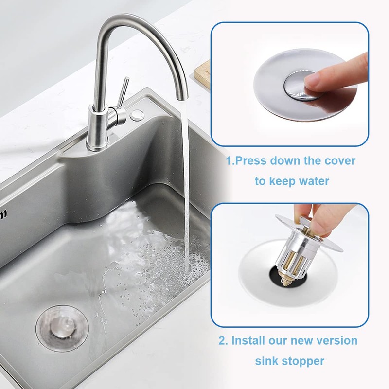 - Easy to install and use: take off the old sink plug and cover our improved sink drain. Press the spring cap of the universal water head to drain or hold water.