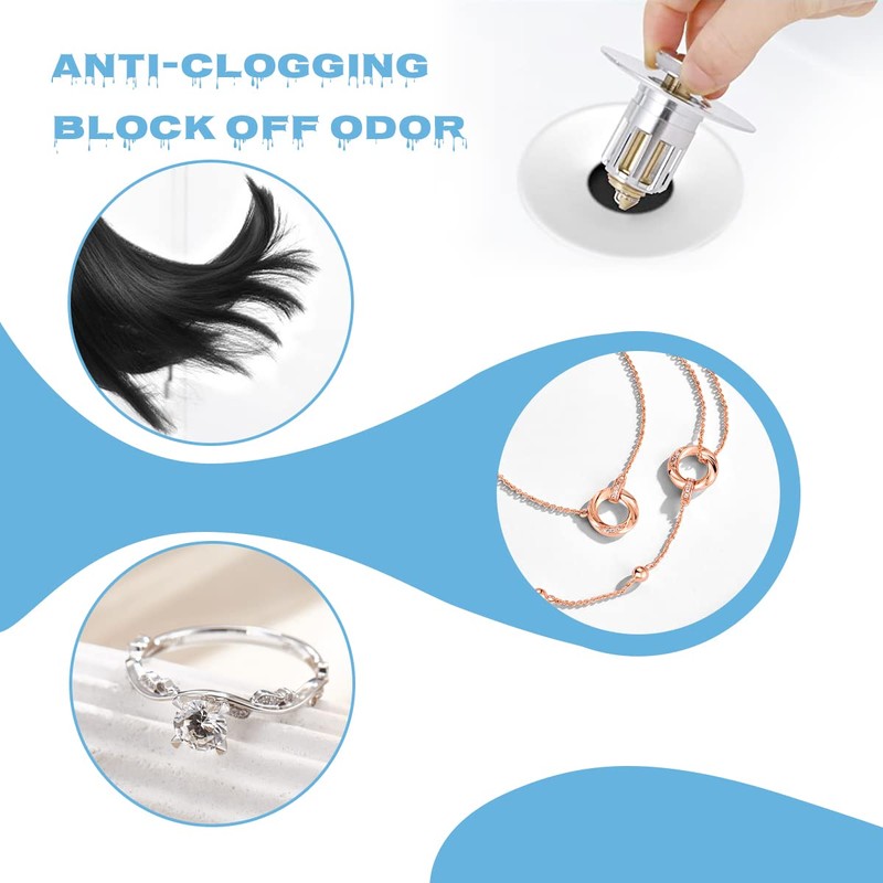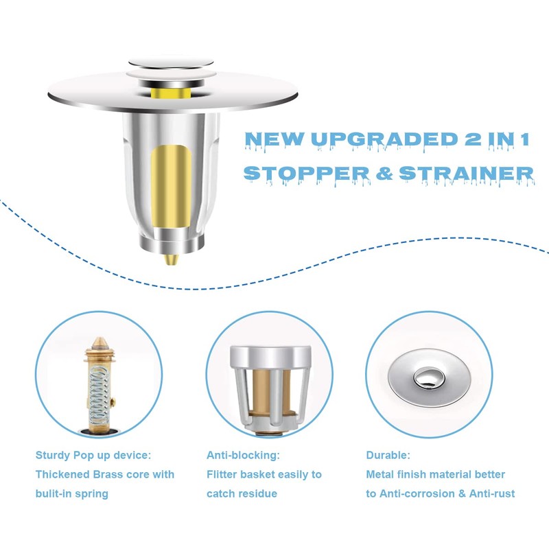 - 2-in-1 sink plug: our bathroom pop-up washbasin plug has a double function of water seal and anti-clogging. Pop-up sink plugs adopt ball core push type to cleverly switch modes of drainage and water storage. Anti-blocking basket design lets you block away with hair, residue and prevent your jewellery from falling into the channel.