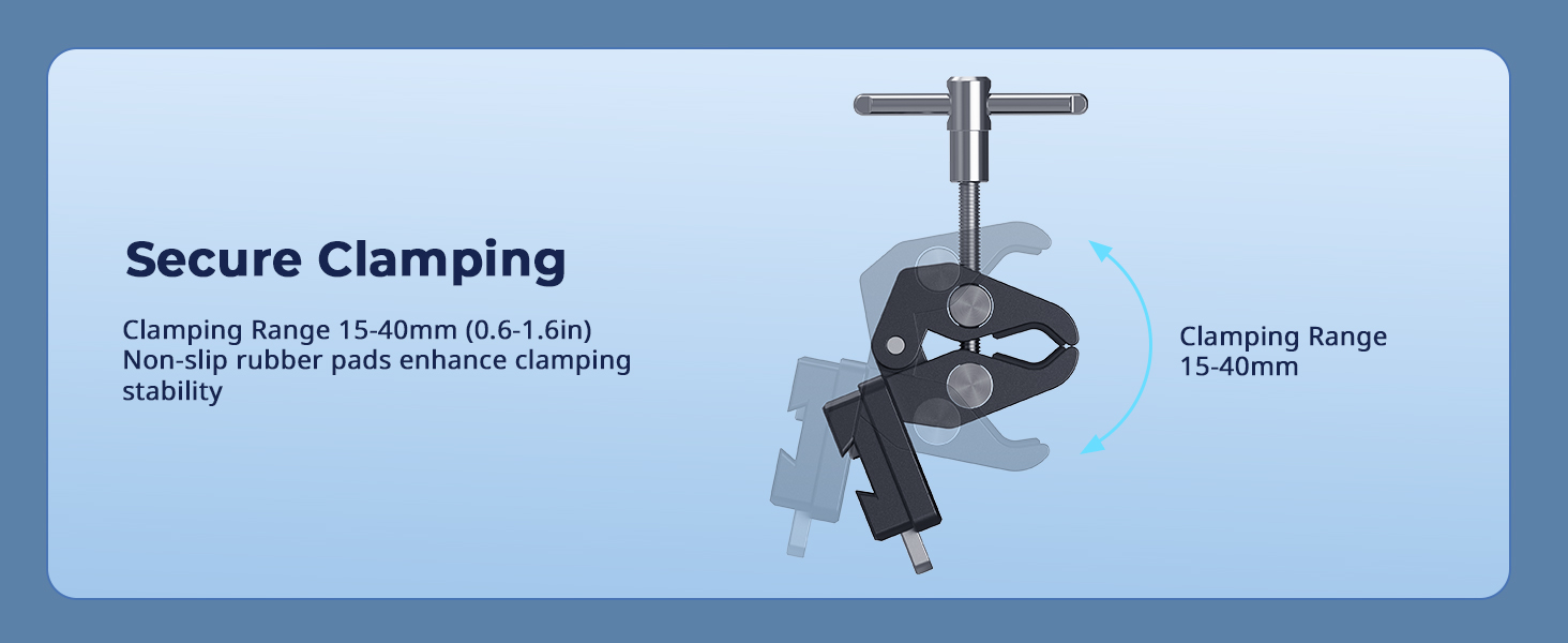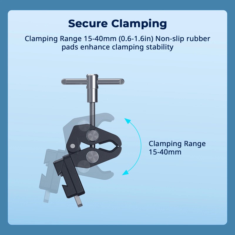 - Anti-Slip Clamping: Clamping range 15mm-40mm, built-in anti-slip pad, safe and stable, to achieve installation in tripods, light stands, handheld rings and other locations.