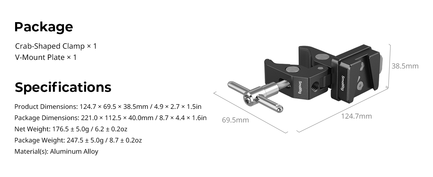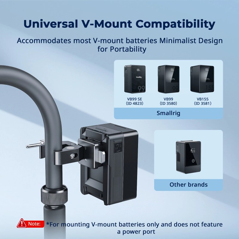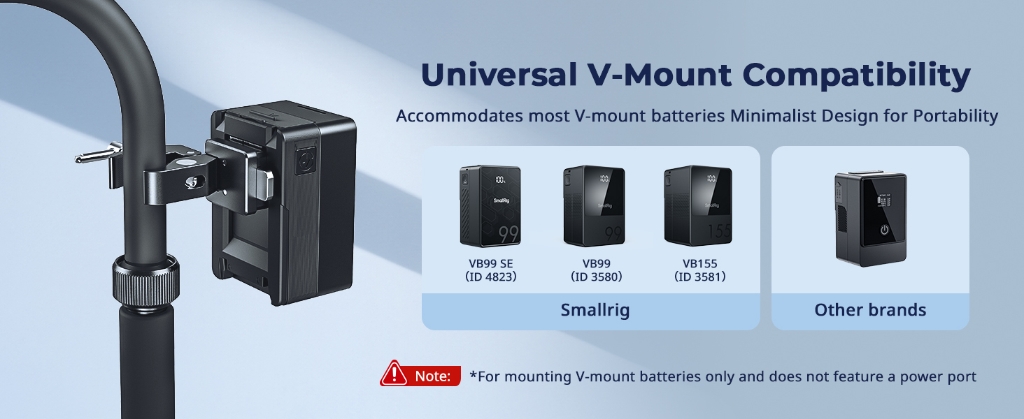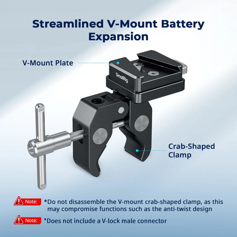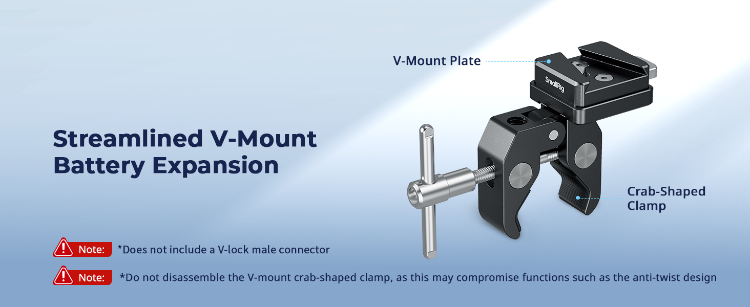 - Note: 1. Do not disassemble the V-Mount crab-shaped clamp, as this may compromise functions such as the anti-twist design.2.This product does not include a V-lock male connector.3.This product is designed for mounting V-Mount batteries only and does not feature a power port.