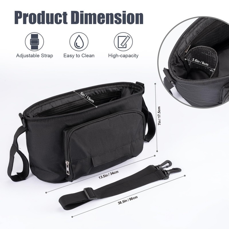 - LARGE CAPACITY STROLLER BAG- The bag measures: 13.5 × 7 inches, comes with two cup holders, one mesh pouch, one wallet pocket, a large main compartment, and a front pocket with a tissue hole which is great for providing easy access to your phones or privacy items and use tissue.