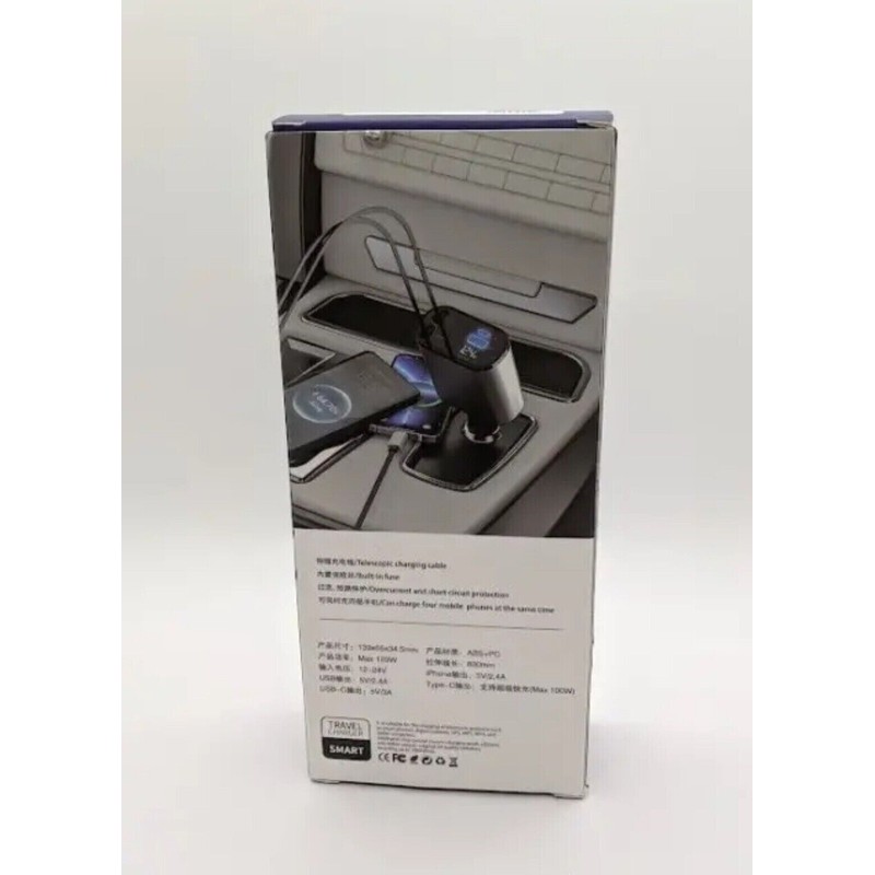 Introducing the Super Fast 4-in-1 Retractable Car Phone Charger with a 66W power output. This charger is compatible with Universal brands and models and features a retractable design for easy storage. It has 4 ports for multiple devices and a Lightning, USB-C, and USB connectivity for versatile charging options. The charger comes with a mounting location that fits perfectly in your car's cigarette lighter.