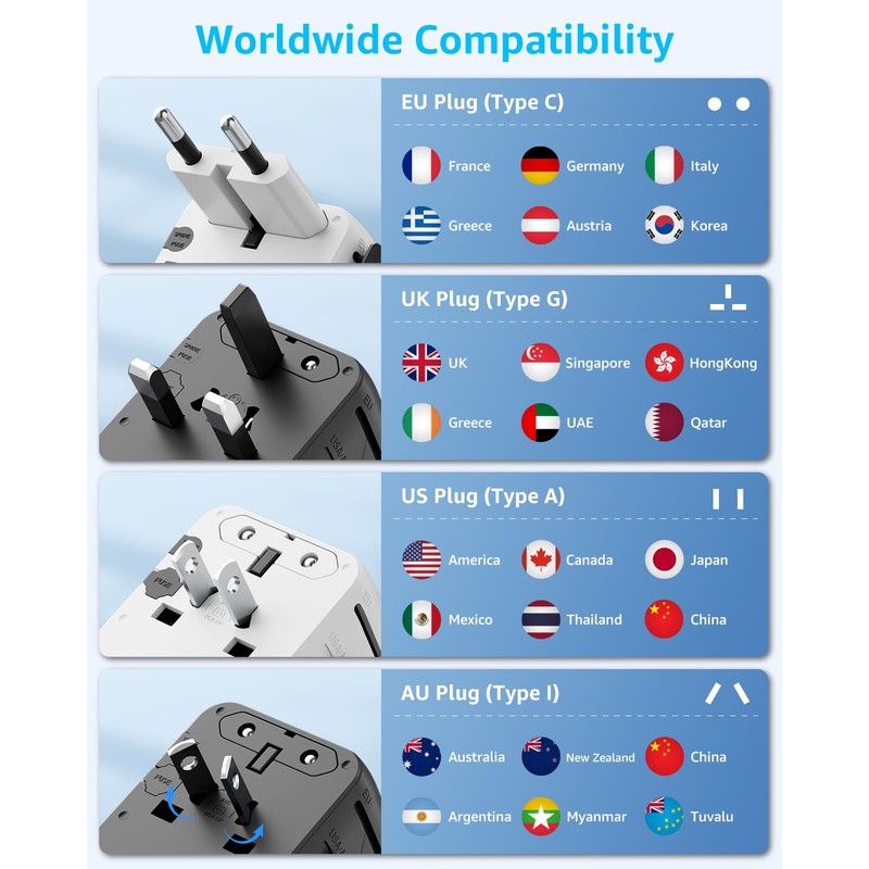 - [Worldwide Compatibility] decqle universal travel adapter is designed with 4 interchangeable plugs which meet international plug standard: 1.Type C(most of the Europe) 2.Type G(such as UK, Ireland, Singapore) 3.Type A(such as America, Canada, Mexico) 4.Type I(such as China, Australia, New Zealand). It can cover 224+ countrires plug standards. *Note: NOT for Type D (mostly used in India), Type M (mostly used in South Africa) and Korea.