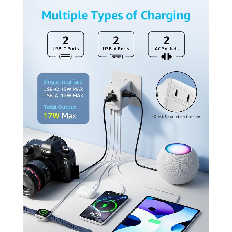 - [4 Additional Interfaces] The adapter has 2 USB-C ports(single 15W) and 2 USB-A(single 12W) port, with a total 17W max output. So it could work as a regular charger for your phone or watch. The intelligent chip can automatically distribute power when multiple appliances are in use simultaneously, protects your devices even though charging the whole night.