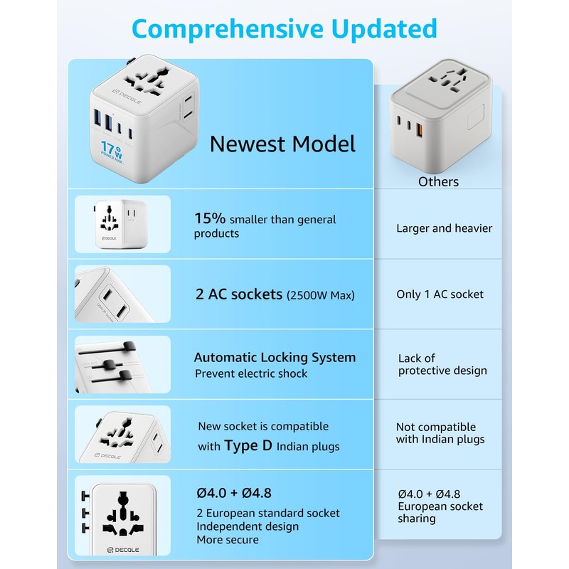 - [Higher Safety Standards] The adapter has 2 international standard 10A fuses(one is replacement), which is available as spare parts from stores worldwide; Updated “Automatic Locking System” could prevent electric shock; Ø4.0 + Ø4.82 european standard socket independent design; The fireproof external PC case can withstand a 750°C fire; more protection etc.