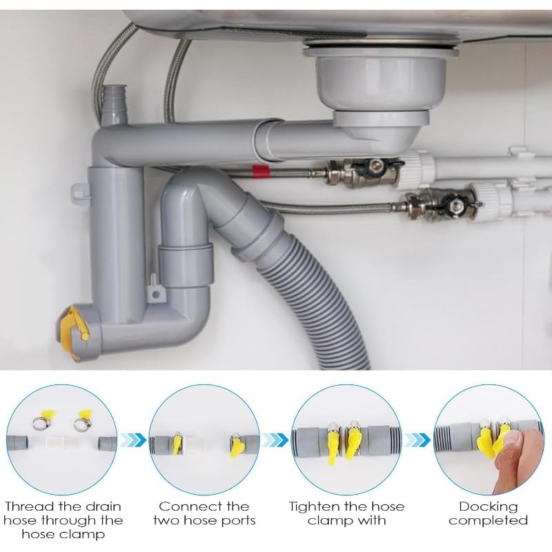 • [Easy installation] : Just insert the molding outlet into the end of the hose without any tools; If you use it for a lengthening hose, just connect the adapters and connect them without removing the previously connected drain, and you can also add a clip for better fixing