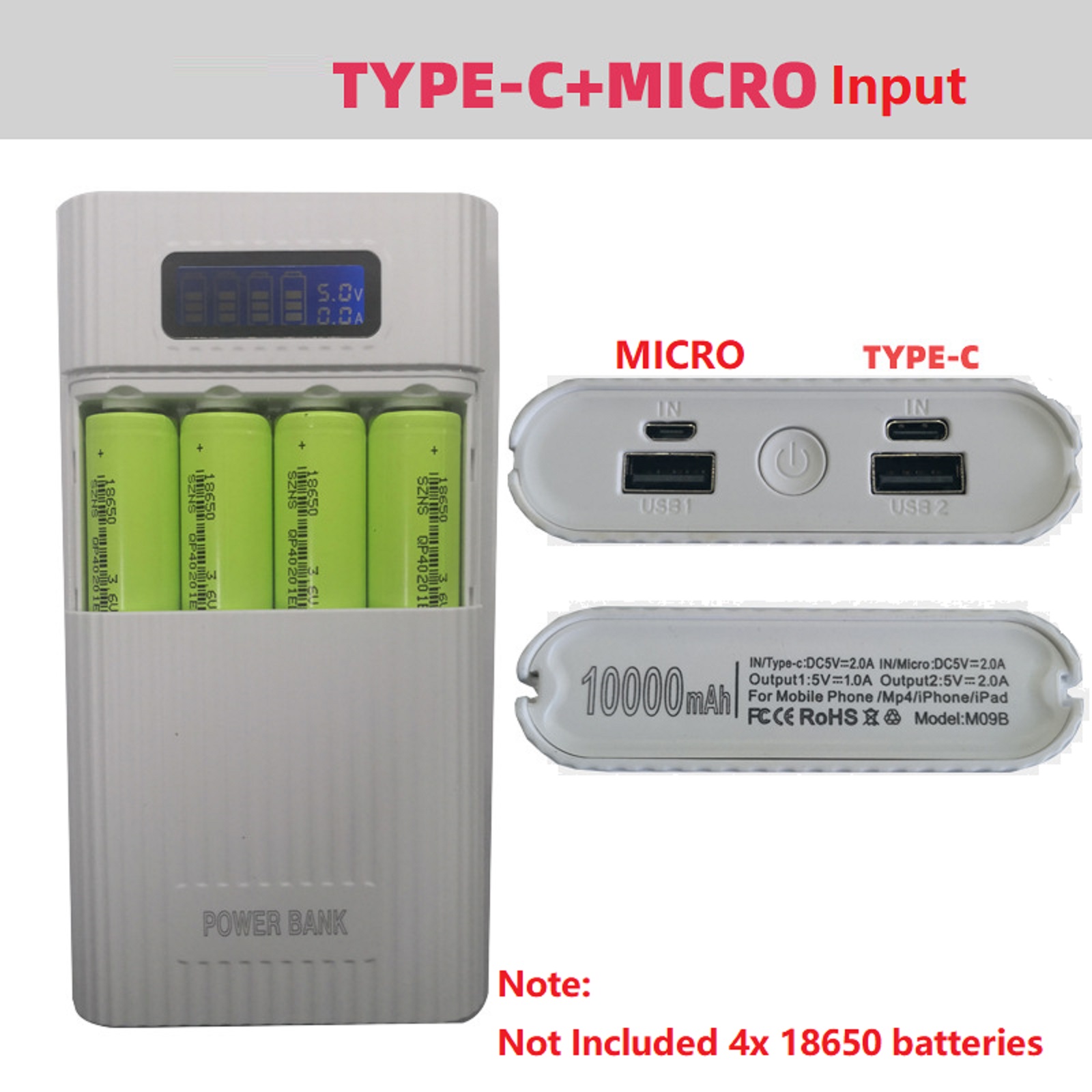 1. 18650 battery charger (the product does not contain batteries). Four section removable mobile power box anti reflection LCD display; Dual USB output and dual input (Micro USB+Type-C interface);