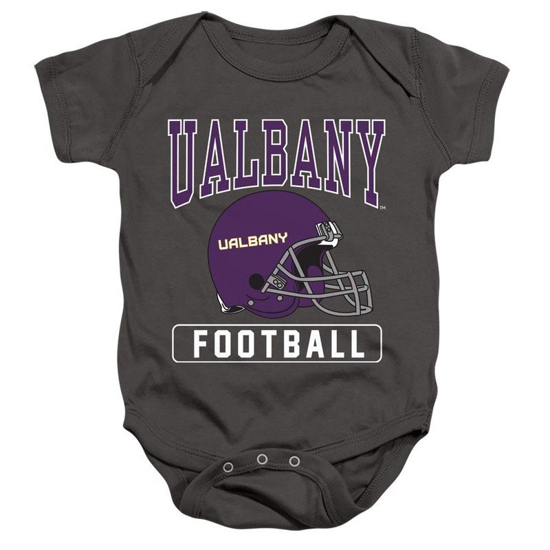 - UNIVERSITY AT ALBANY OFFICIAL FOOTBALL HELMET UNISEX SNAP SUIT - Our unisex infant snap suit is constructed of 100% cotton with short-sleeves and is perfect for your baby girl or boy.