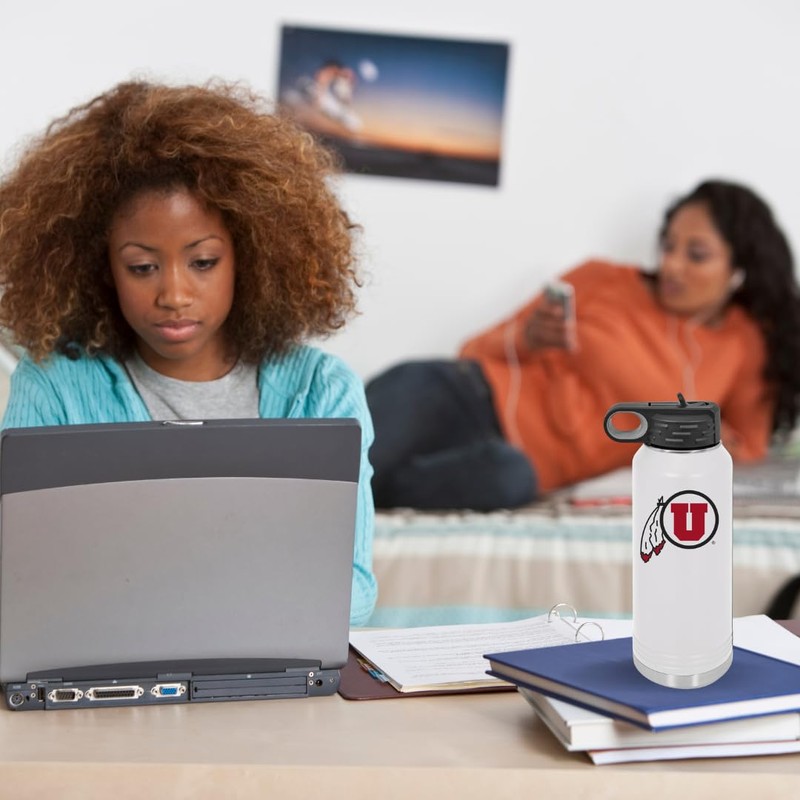 University of Utah 32oz Stainless Steel Double Walled White Beverage Bottle with Flip Straw Spout - College Gear for Playoff Season – For Office, Home or Auto – Show your Utes Pride