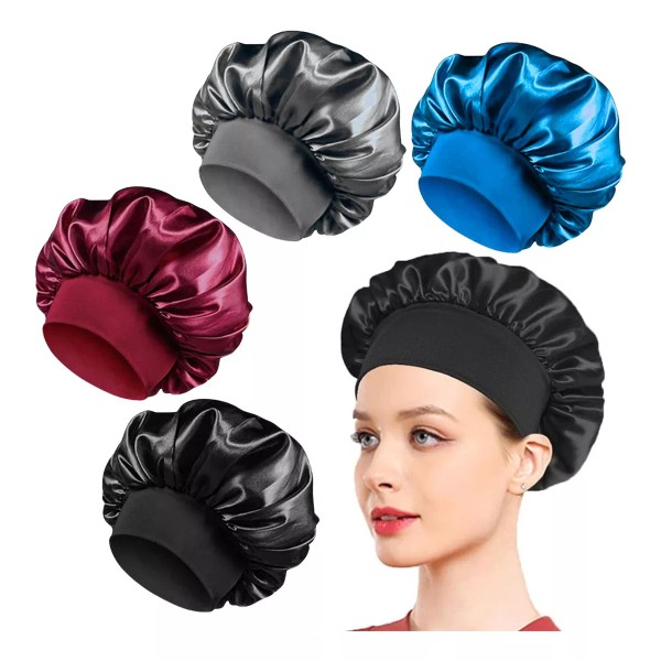 Bandas elásticas de alta calidad: el nuevo capó de seda cuenta con una boca elásticas ancha de alta calidad que es elástica pero no se hunde para envolver bien tu cabello, evitando que el cabello se filtre o se caiga durante el sueño sin apretar la cabeza.