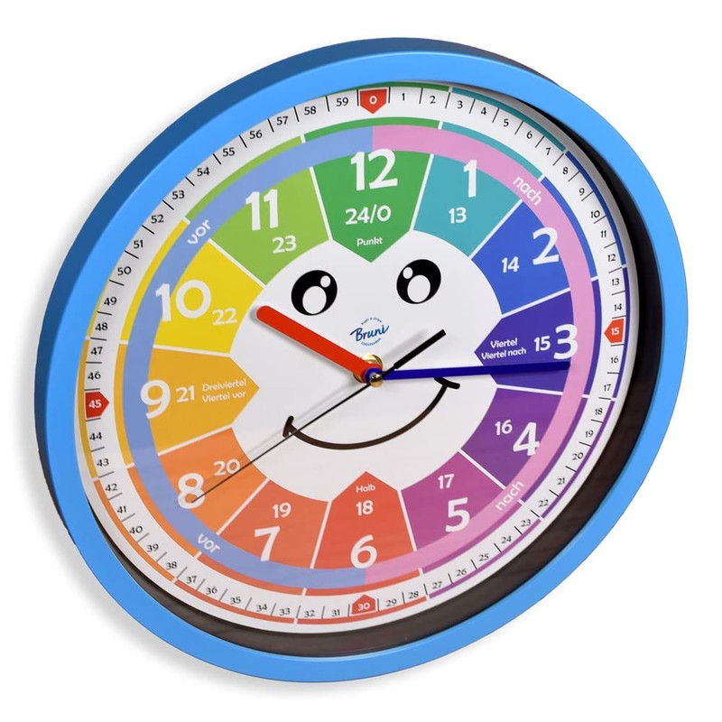 Univok children's watches for children's rooms are available in different designs. One of these is the learning watch from Univok. Learning to tell the time is fun with this watch. It displays the time in twelve hours and 24 hours format. The individual minutes are marked as a number. The colours make it very easy to distinguish. Colourful hands - red hour hand, blue minute hand and black second hand help as children learn very well visually. The teaching clock is also ideal for teaching time to learn the time.
