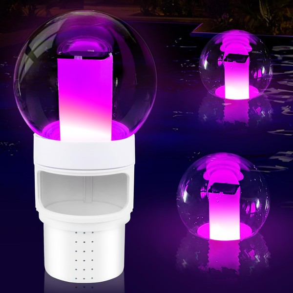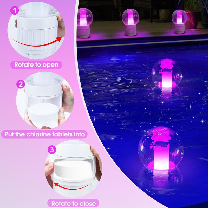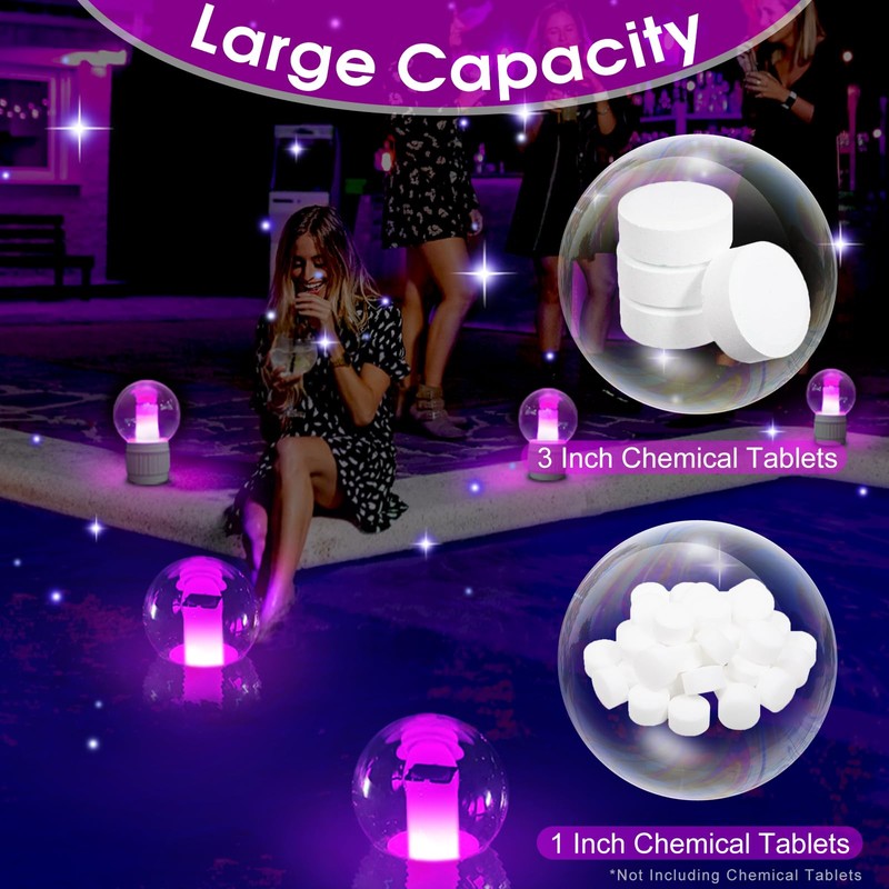 - Solar Light Pool Chlorine Floater: Better than the standard chlorine floater, our chlorine pool floater combinate with the solar pool light. The solar lights really does make for an atmospheric and gorgeous pool at night. Auto charges in the sunlight, without any shelter and auto lights up the pool at night. As floating pool light,the chlorine tablet floater perfect for family night time swims or spas. The pool chlorine floater has been turning on every night without missing a beat