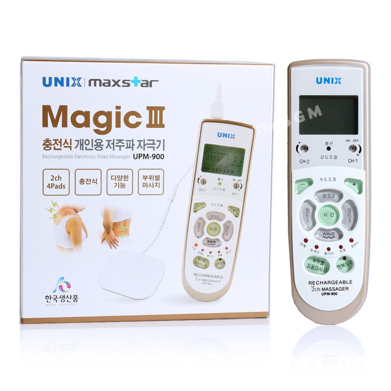 Unix [Official Retailer] Magic III Rechargeable Low Frequency Stimulator UPM-900A (Main body + 4 pads + Pad storage stand + Storage pouch + Charging adapter + Necklace) / 유닉스 [공식판매점] 매직III 충전식 저주파 자극기 UPM-900A (본체+패드4매+패드보관대+보관파우치+충전아답터+목걸이)