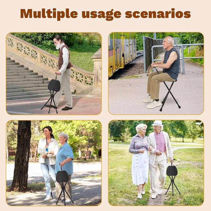 - Walkers for Seniors with Seat & Compact Storage Versatile Support-With a triangular support structure, this folding cane holds up to 330 pounds, making it a reliable choice as a walking cane with seat. Unlike rigid hurricane cane designs, our 3-in-1 system transitions from walking aid to travel chair.Can put in backpack/car trunk storage, supporting seniors' balance during errands or outdoor activities.
