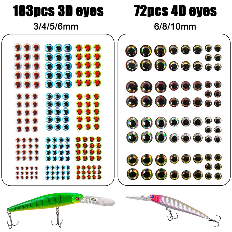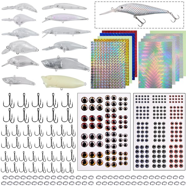 - 【378PCS LURE MAKING KIT】378pcs unpainted fishing lures kits with 12pcs blank crankbaits + 40pcs treble hooks + 60pcs split rings + 10pcs fishing lure stickers + 183pcs 3D fish eyes + 72pcs 4D fish eyes.