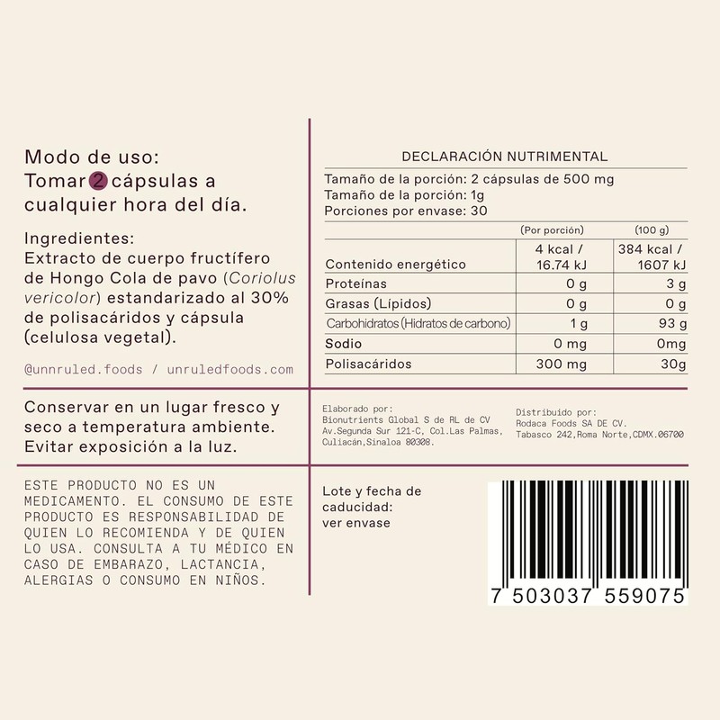 UNRULED - Cola de Pavo | Extracto Puro de Hongo Cola de Pavo en Cápsulas | 60 Cápsulas Veganas Suficientes para 1 Mes | 30 Porciones de 1000mg | Hongo Adaptogeno 100% Natural