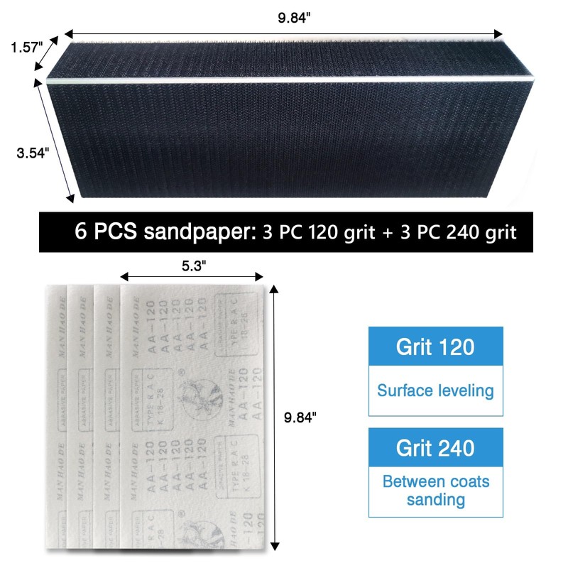 - Equipped with 6 PC sanding papers: 3 PC each 120, 240 grit.