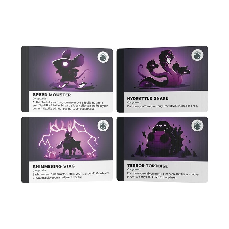 • The box contains: 5 dice, 4 double-sided player boards, 7 Hex tiles, 52 main deck cards, 10 Companion cards, 10 Counterspell cards, 4 meeples, and 13 double-sided resource tokens