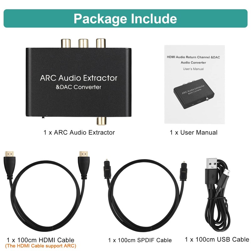 Package Content 1 x HDMI ARC Converter, 1 x USB Cable, 1 x User Manual, 1 x HDMI Cable, 1 x SPDIF Cable