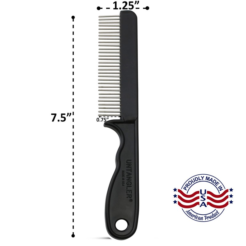 Super Groom II comb has 30 narrow spaced silky smooth rotating teeth that move and glide, lifting out loose hair and clearing small mats with less pulling on the animal's tender skin. Rotating teeth are much more gentle to pet skin. Each tooth of the comb is designed to rotate independently, providing a gentle, fluid motion that detangles hair without pulling giving animals more comfort. The comb teeth are made with 100% solid stainless steel that naturally prevent static build up during combing. Stainless steel teeth will never tarnish and can be safely disinfected or cleaned with warm water and gentle soap. Super Groom Combs also features round smooth tips that gently rub the animal's skin during combing. The rubbing motion on skin increasing circulation and stimulates natural oil production keeping skin healthy and giving the coat a natural sheen. Daily combing spreads natural oils through the coat improving health and increasing coat sheen. The comb pins are securely sonic welded into the spine to prevent fall out and injury. The Super Groom is manufactured and hand assembled by a dedicated team at Steven Plastics Inc, Hoffman Estates IL. USA. Comb is recommended for silky, fine, wavy coats including Yorkies, Havanese, Lhapa Apso, Maltese, Australian silky Terrier, Wheaten Terriers. Comb is effective for feline coats including Ragdolls, Persians, Norwegian's Maine Coons and others.