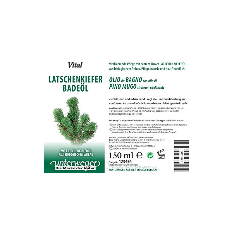 - Use: add 10 ml of mountain pine bath oil to 100 litres of water.