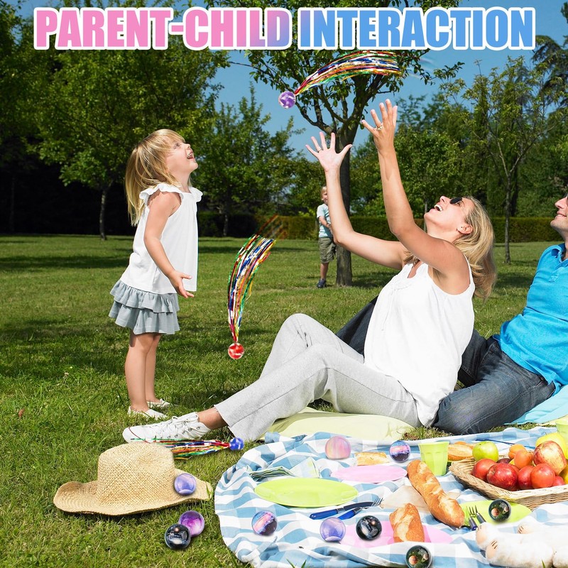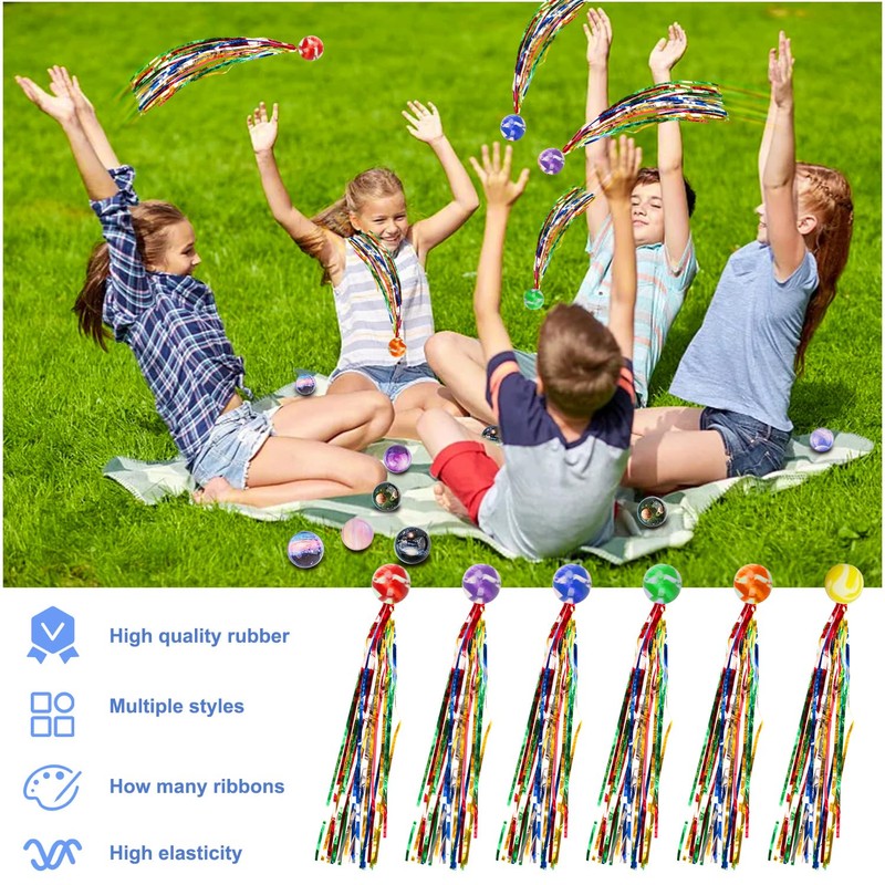 - Colourful jumping ball with ribbons: the bouncy ball is decorated with 25 cm long, colourful streamers that look like bright tails. Coloured ribbons not only add a cheerful touch to the balls, but also allow for easy grip and throw.
