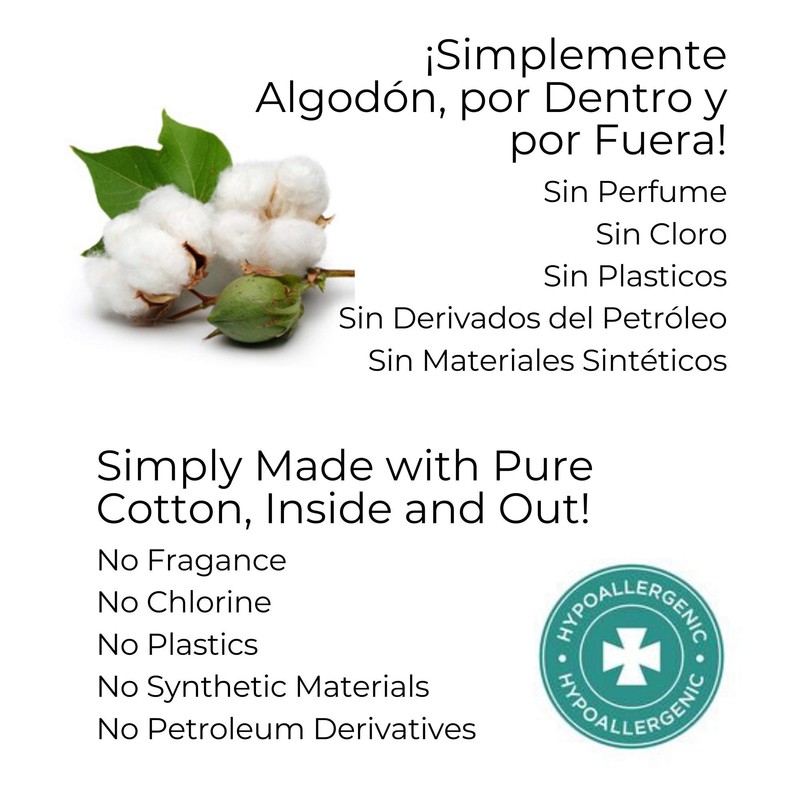 - Simply cotton inside and out. No synthetic materials, no chlorine, no plastic, no perfume, no petroleum, extra soft, extra thin, super absorbent and hypoallergenic