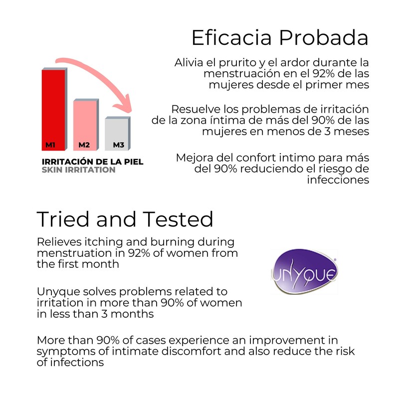- Proven effectiveness: 92% of women using UNYQUE reduce itching and burning skin from the first month of use. More than 90% of women solve their intimate irritation problems during the first 3 months of use.