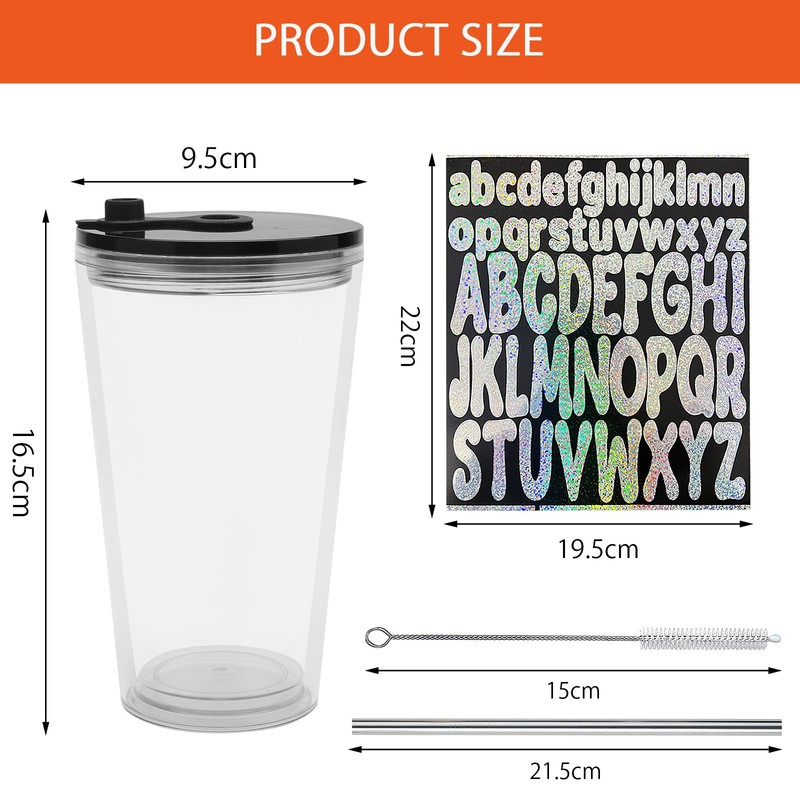 - Product contents: buy our product, you will receive a 16 oz (480 ml) drinking cup with lid and straw, a glitter sticker with 26 letters and a straw brush for easy cleaning and personalised decoration.