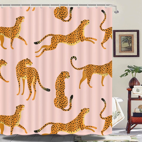 Uokiuki Boho Leopard Fabric Shower Curtain - Tropical Animal Cheetah - Pink with Hooks 69 x 84 Inch