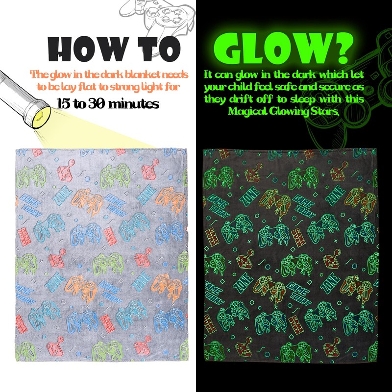 - Gaming Gifts For Kids: Get it now to surprise your kids Boys on Birthday, Christmas, Halloween, Easter, Thanksgiving or any occasion. Gamer glow in the dark blanket is the best friend for kids at night, which can inspire funny ideas for kids to enjoy the magical glow whether they are having sleepovers or playing or just cuddling on the couch.