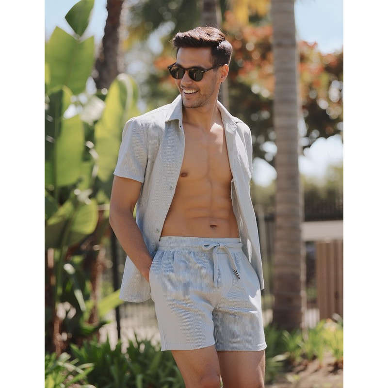 UOUA 2 Piece Short Sets for Men Summer Beach Outfits Stripe Texture Button Do...