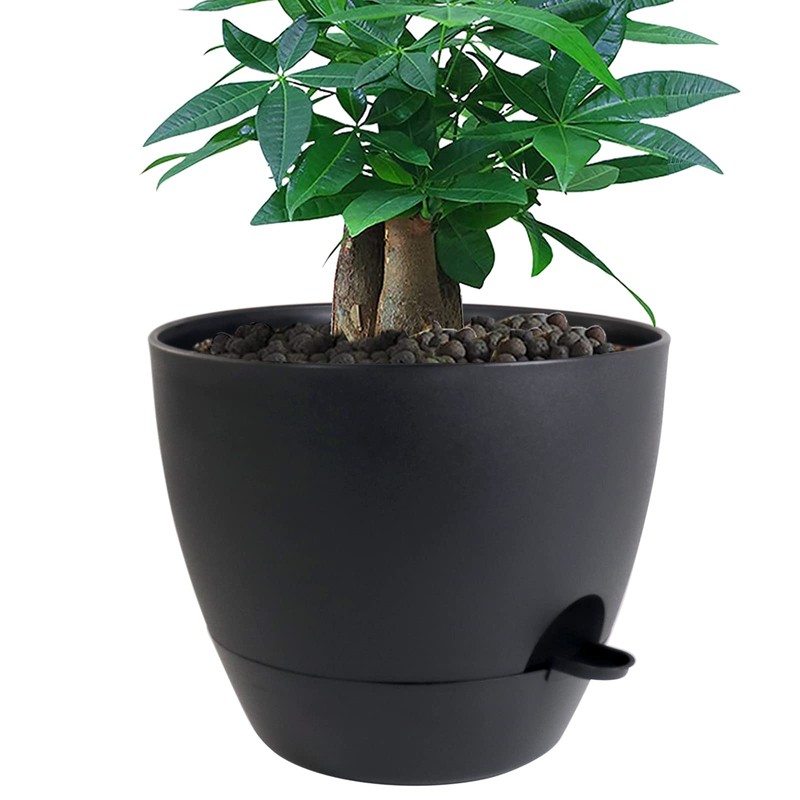 - [Depósito profundo grande de 67 onzas, agua extra de 2 a 3 semanas] La maceta extragrande de 12 pulgadas con depósito profundo hace que sea fácil para cuando vayas en vocación que no necesitas que alguien venga sobre plantas y flores. Bandeja integrada que protege cubiertas, patios o superficies interiores. (Dimensiones: 12 pulgadas de ancho x 10 pulgadas de alto)