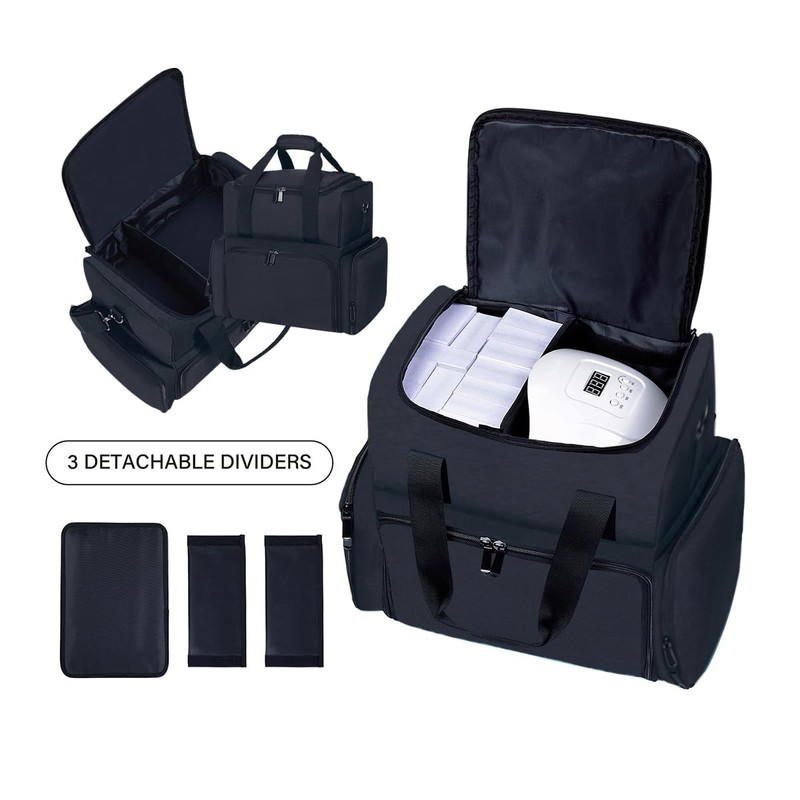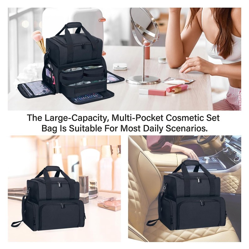 - 【Large Capacity】Dimensions: Length: 15.74inch/40cm, Width: 9.05inch/23cm, Height: 13.38inch/34cm.The travel cosmetic case features double-layer design and multiple storage to organize your all cosmetics. Top compartment comes with detachable dividers for convenient customization to your storage needs. (Empty bag only, NOT includes any cosmetics.)