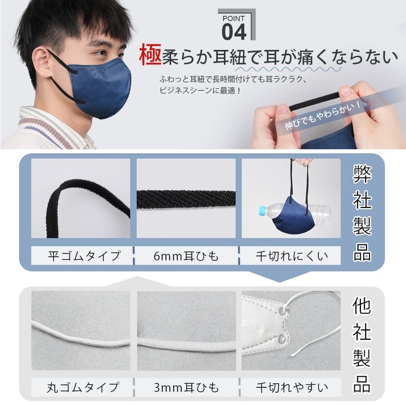 - 【耳が痛くならない】マスクは幅6㎜のストレッチ耳ゴムを採用し、幅広なひもで耳への負担を軽減できて、長時間つけていても耳が楽です。また、耳ひもも非常に柔軟な素材を使用し、ソフトで切れにくく、着け心地も快適です。