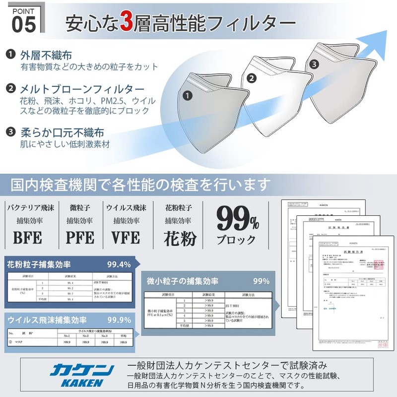 - 【日本KAKEN検品·99%カット】三層構造の高密度フィルターを採用!日本権威的な検定機関KAKENのカケンテストをクリア!高い防護性能はBrodio快適さの前提となっています。日本の検査機関でフィルター性能の検査を行い、(微粒子)PFE99.6%、(バクテリア飛沫)BFE99.6%、(ウィルス)VFE99.5%以上、安心・安全の高品質フィルターを使用し、花粉や細菌を99%カット。