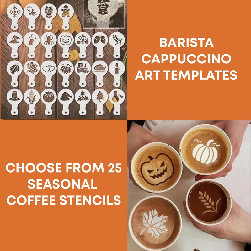 - Festive Fall & Winter Designs – 25 Coffee stencils latte art to create leaf, pumpkin, snowflakes, and holiday tree designs on lattes, cappuccinos, or hot cocoa in seconds; dust with cinnamon, cocoa, or powdered sugar