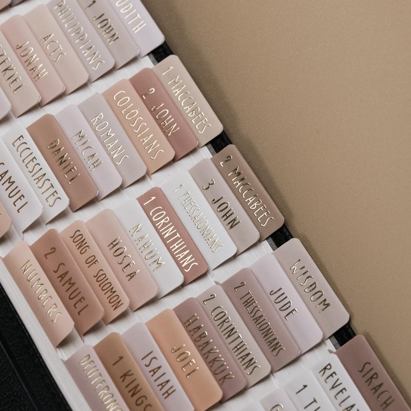 - Unique: Bible tabs with Summary Descriptions and Gold Foil Embossed Lettering.Catholic bible tabs 73 books,This is the ideal christian gi.ft. These unique Bible index tabs make a great gi.ft for your girlfriend, mum, kids, or anyone who loves beautiful things in life.