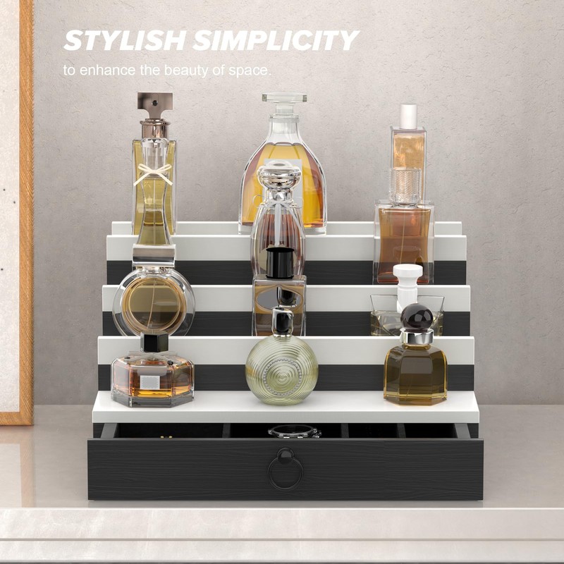 - DIVIDED DRAWER COMPARTMENTS FOR MEN'S STYLE: The cologne organizer is compactly designed to enhance the aesthetics of your space.The bottom divider drawer keeps your belongings at a glance and allows you to store watches, rings, bracelets and necklaces. Each level holds multiple bottles of perfume to showcase your unique fragrance tastes, allowing you to easily access and choose your favourite scent.
