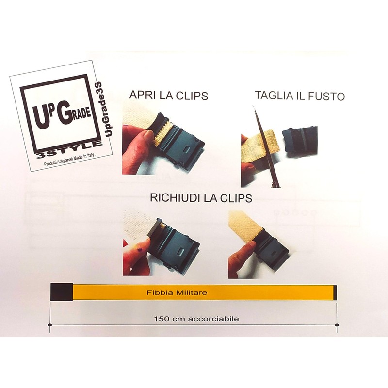 • To shorten the belt, simply open the clip on the back of the metal buckle, slide the shaft into the buckle (or pull it out as shown in the photo) until you get the desired size. Cut off excess material and close the clips. Quick and intuitive operation.